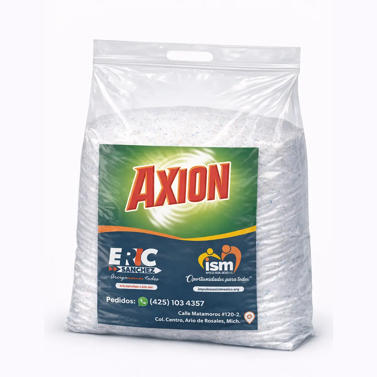 Jabón en polvo AXION de 10 kg para lavado de ropa. Rendidor, práctico y económico en presentación a granel.
