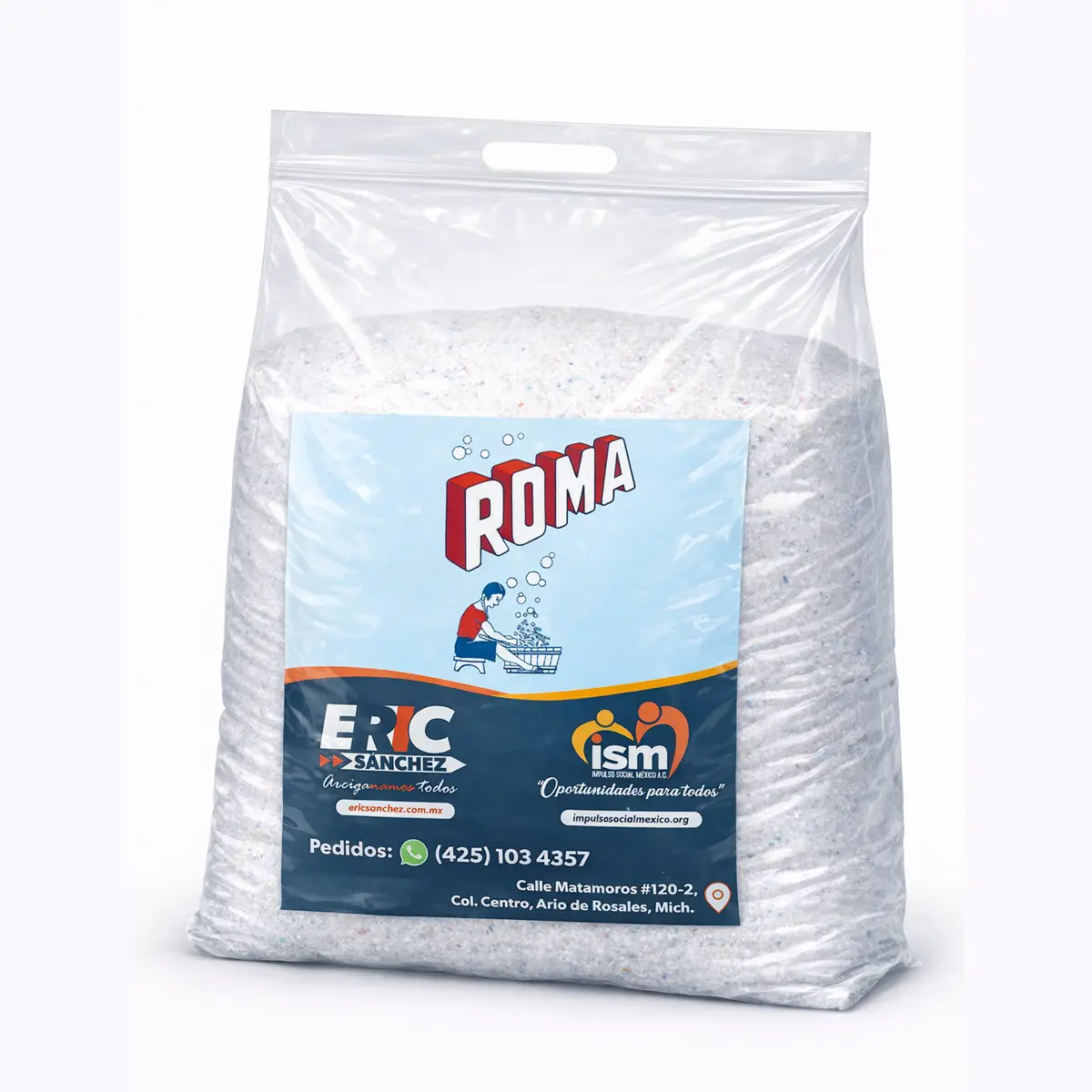 Jabón en polvo ROMA de 10 kg para lavado de ropa. Ideal para uso diario, alto rendimiento y ahorro en hogares de zonas rurales.